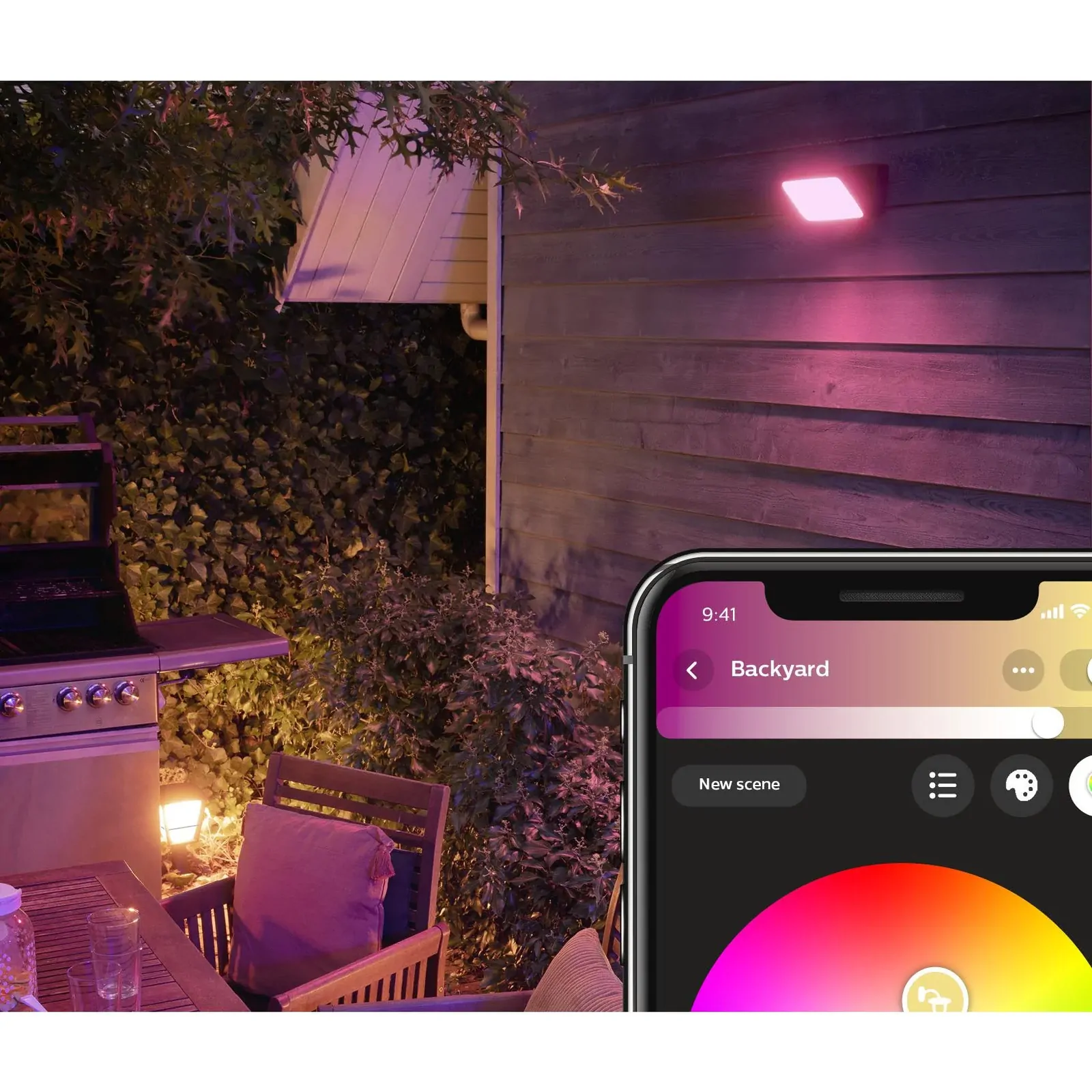 Family or friends coming over? Set your outdoor lights to match the occasion. Whether it's a cozy dinner on the balcony, a BBQ on the patio or party in the backyard, you can add a touch of magic to every get-together with Philips Hue. Create colourful scenes or slow-moving dynamic effects to enjoy these special moments to the fullest.
