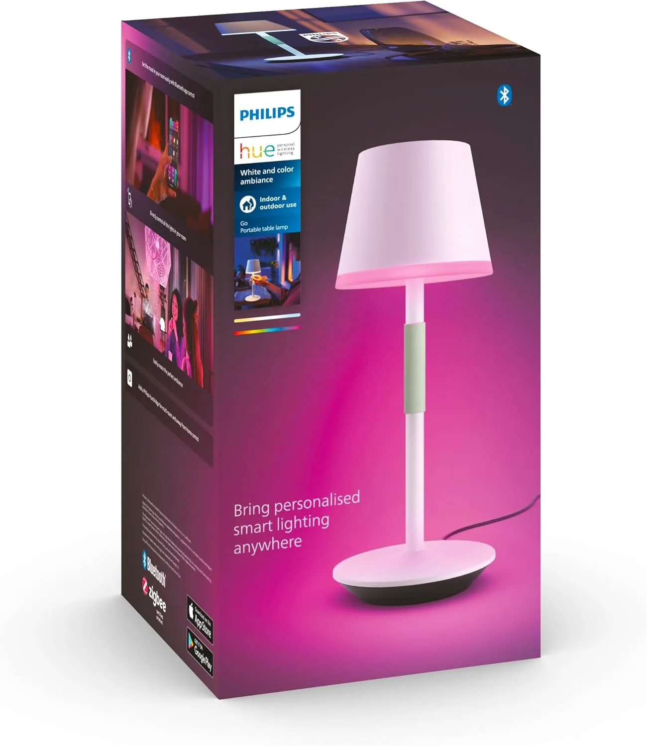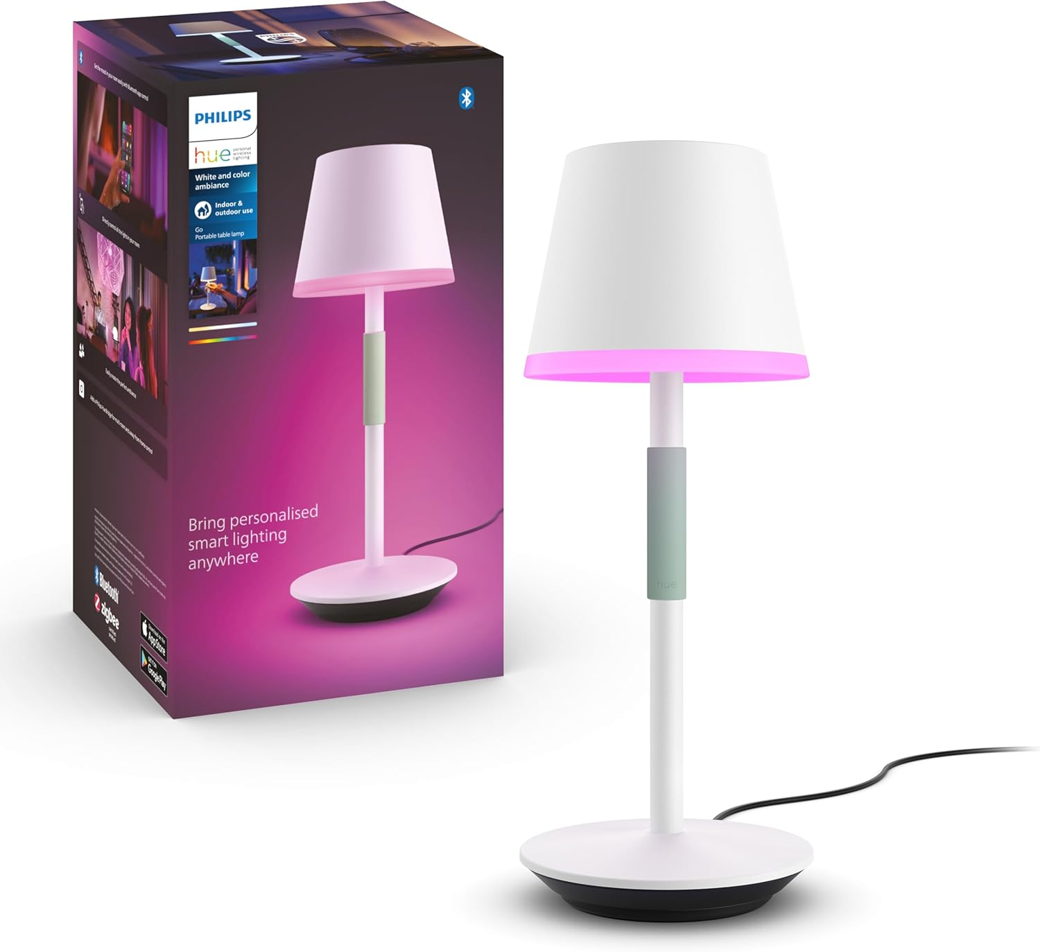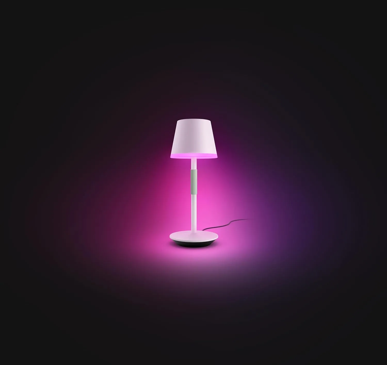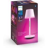 Illuminate your living space with the Philips Hue Go Portable Table Lamp. This stylish lamp features a sleek white design with a pop of pink colour around the base, adding a touch of vibrancy to any room. The lamp's portable nature allows you to move it seamlessly from one area to another, providing versatile lighting solutions. Powered by Philips Hue technology, you can effortlessly adjust the brightness and colour temperature to suit your mood or activity using the accompanying app. With its compact size and cordless operation, this lamp is perfect for creating a cosy ambience in your home or office. Experience the convenience of modern lighting with the Philips Hue Go Portable Table Lamp.