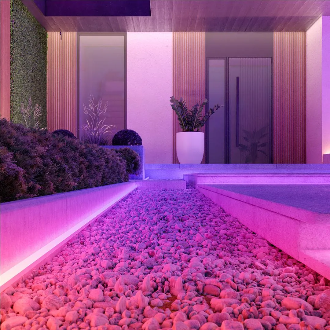 For outdoor gradient direct light experience, Hue Neon Outdoor Strip Light is meant to be shown, like path lighting or wall lining. Set the mood with any of the default scenes or customize your own scene for the perfect ambiance that fits your garden.