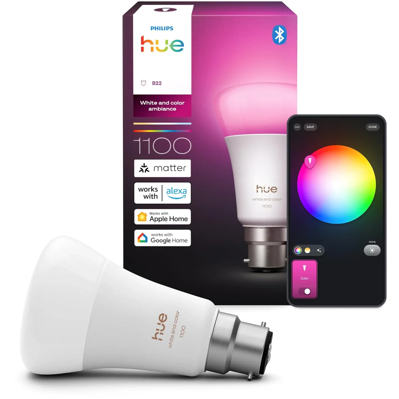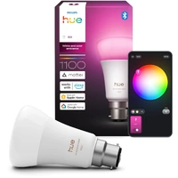 Use this B22 smart LED bulb in any standard fixture with a bayonet fitting to get millions of shades of white and color light. With wireless dimming, this bulb lets you set the mood instantly. Unlike other bulbs designed to have light effects and colors for individual light points, Hue offers a cohesive room and home experience. In short, everything works together seamlessly to deliver the best color experience for our consumers.