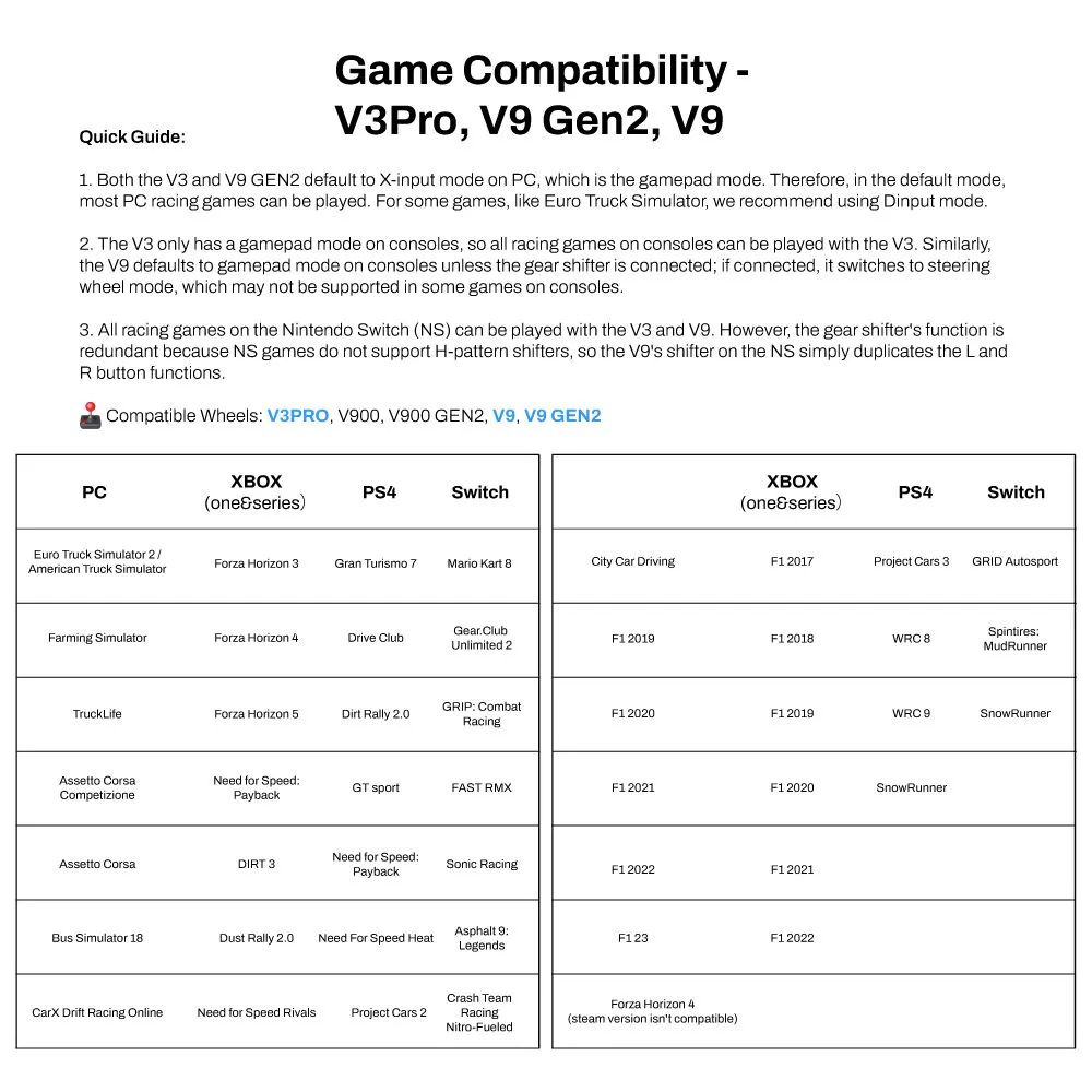 • Multi-Platform Compatibility: PXN V9 GEN2 compatible for PC, PS3, PS4, Xbox One, Xbox Series X/S, and Switch1/Switch2. It features a dedicated app for adjustments, allowing personalized steering wheel settings. Players can download and install the "PXN Wheel" app from the Apple App Store or Google Play. (Note: The gear shifter is only compatible with simulation driving games and not with racing games.)
