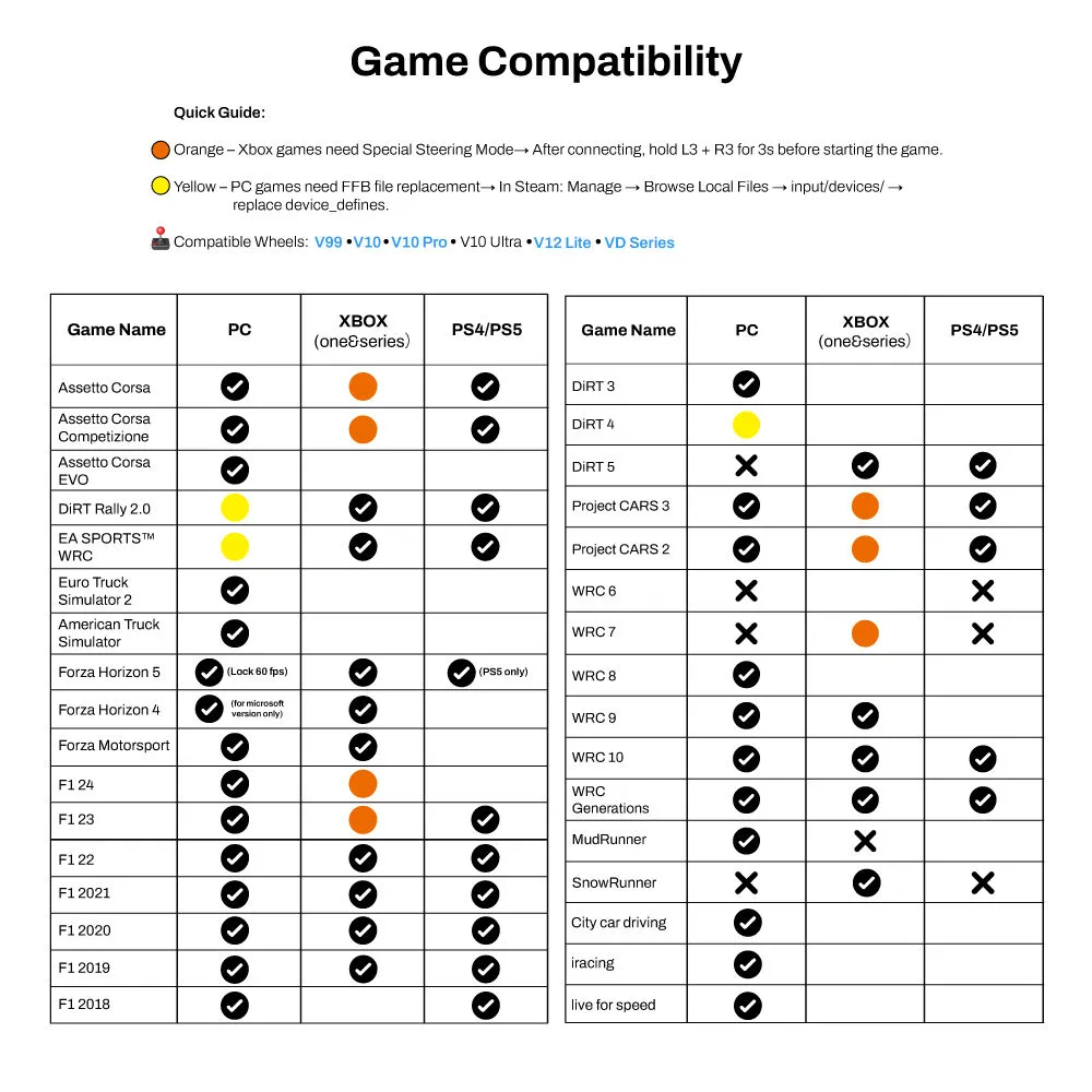 Equipped with a 16-bit encoder resolution, the V10 Pro ensures ultra-precise steering input. The detachable 270 mm (11-inch) steering wheel supports 270°/900° rotation to match different racing styles, while the companion APP and PC software allow advanced control, parameter adjustments, and configuration presets for a personalised racing setup.