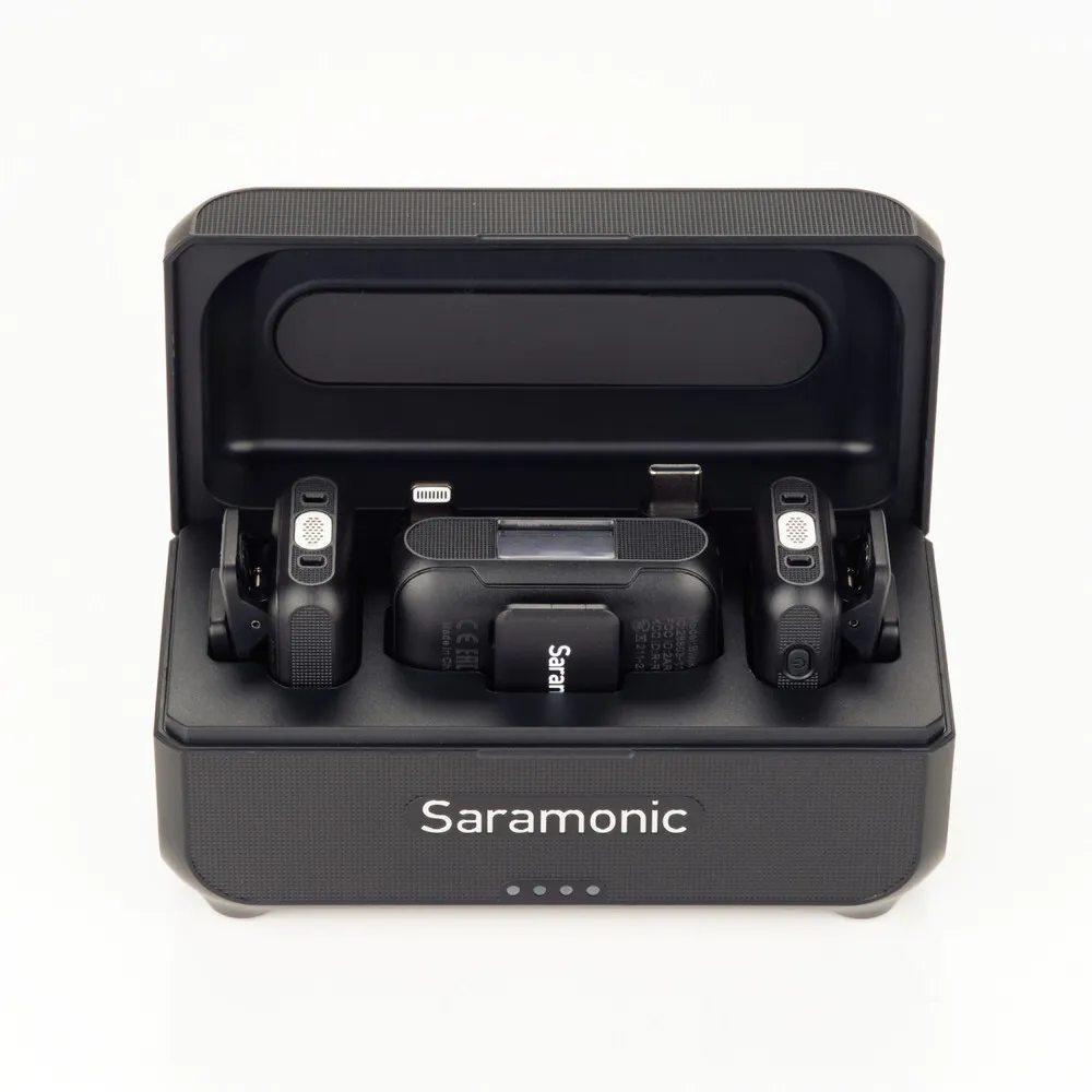 The Saramonic Blink 500 B2+ is an incredibly easy-to-use 2-person wireless clip-on microphone system with universal compatibility and powerful professional features. Allowing creators of all experience levels to record high-quality audio for their content and simply. It features 2x micro transmitters with built-in omnidirectional mics, 2-stage active noise-cancelling, remote gain control, mute, and furry windshields for high-wind protection. Its compact 2-channel receiver mounts to your camera shoe or directly to your device’s USB-C or Lightning port and features a 3.5mm Headphone out, Mono, Stereo, or Safety output modes, 75/150Hz Low Cut Filters, and Mobile Device Speaker Monitoring. The system also includes a portable charging case and a drawstring pouch to charge and protect your system when on the go.
