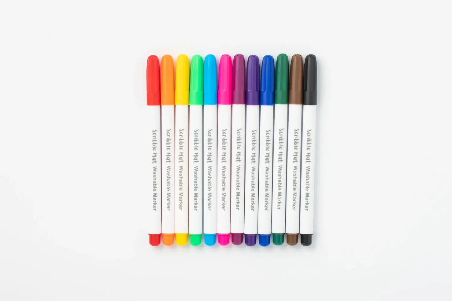 12 x washable pens in the colours red, orange, yellow, light green, dark green, light blue, dark blue, purple, magenta, pink, brown and black