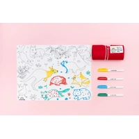 Convenient felt storage pouch – Never lose a pen again with our signature felt storage pouch! Tying up securely with elastic, the durable felt pouch contains slots to house the silicone mat and four pens, helping little ones keep track when packing up independently. The roll-up felt pouch makes this colouring pack a portable, all-in-one activity for on-the-go creativity.