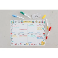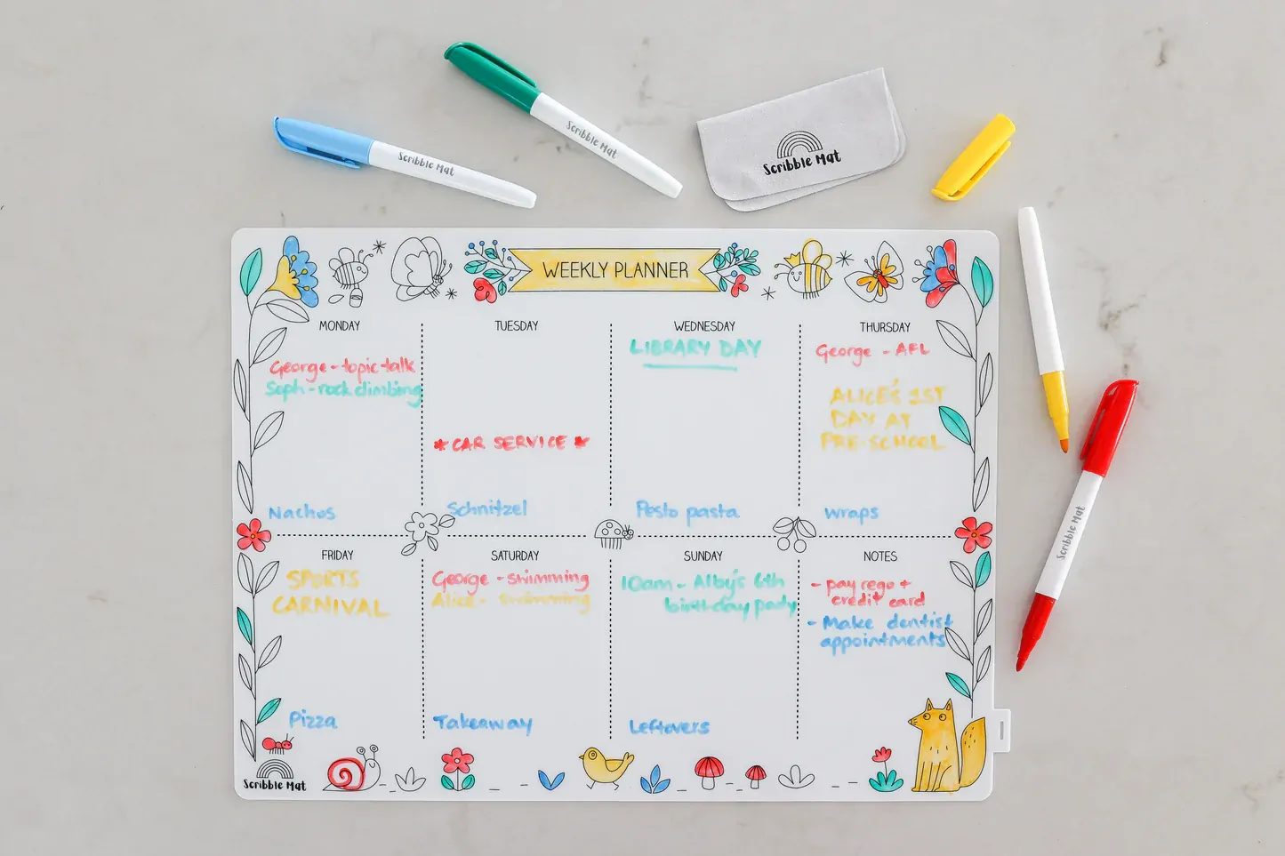 Colour code with four pens – Use the pens to colour code activity types or family members. Our pens feature vivid, quick-drying ink that minimises smudging. Our pens are dry-erase, which means they can be wiped clean with a dry or damp cloth from our silicone mats without staining. Please note that we cannot guarantee that they will not stain clothing, thus supervision whilst children are using the pens may be necessary. For pens that wash out of clothing, see our NEW washable pen sets.