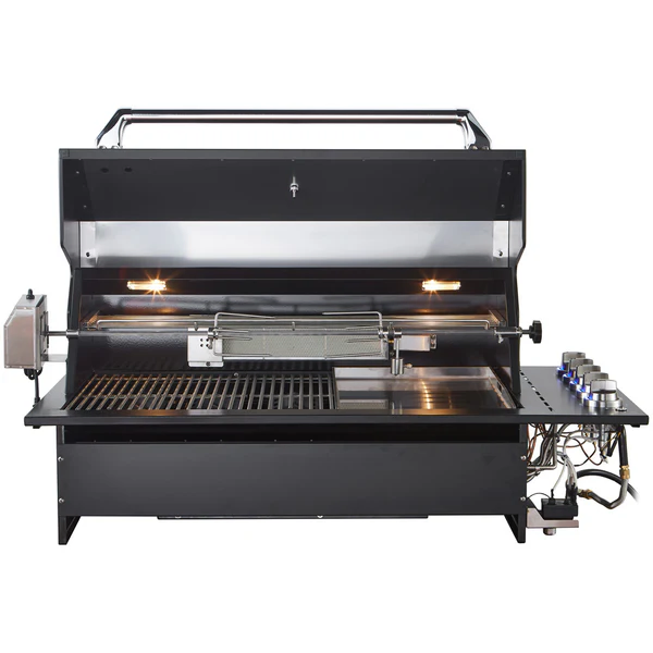 The Drop-In 5 Burner Gas BBQ is essential for creating restaurant-quality meals in your own backyard. The durable stainless-steel construction and sleek black finish give it a timeless aesthetic that will look great in any outdoor space. It comes with three high-quality 304 grade stainless tube burners, one infrared power burner located under the 5mm thick high-grade stainless teppanyaki plate, and one infrared rotisserie burner, so you can easily prepare a variety of dishes. Plus, the double-skinned hood with rotisserie and thermostat allows you to maintain an even temperature while cooking with the lid closed. It includes a powerful motorised rotisserie for perfectly roasting larger cuts of meat. This Drop-In 5 Burner Gas BBQ also includes a weatherproof UV-protected cover as well as stainless steel warming rack and removable grease drip tray for mess-free grilling. With its three-year warranty period and natural gas conversion ability, you can trust this product to be the backbone of your outdoor kitchen setup.