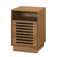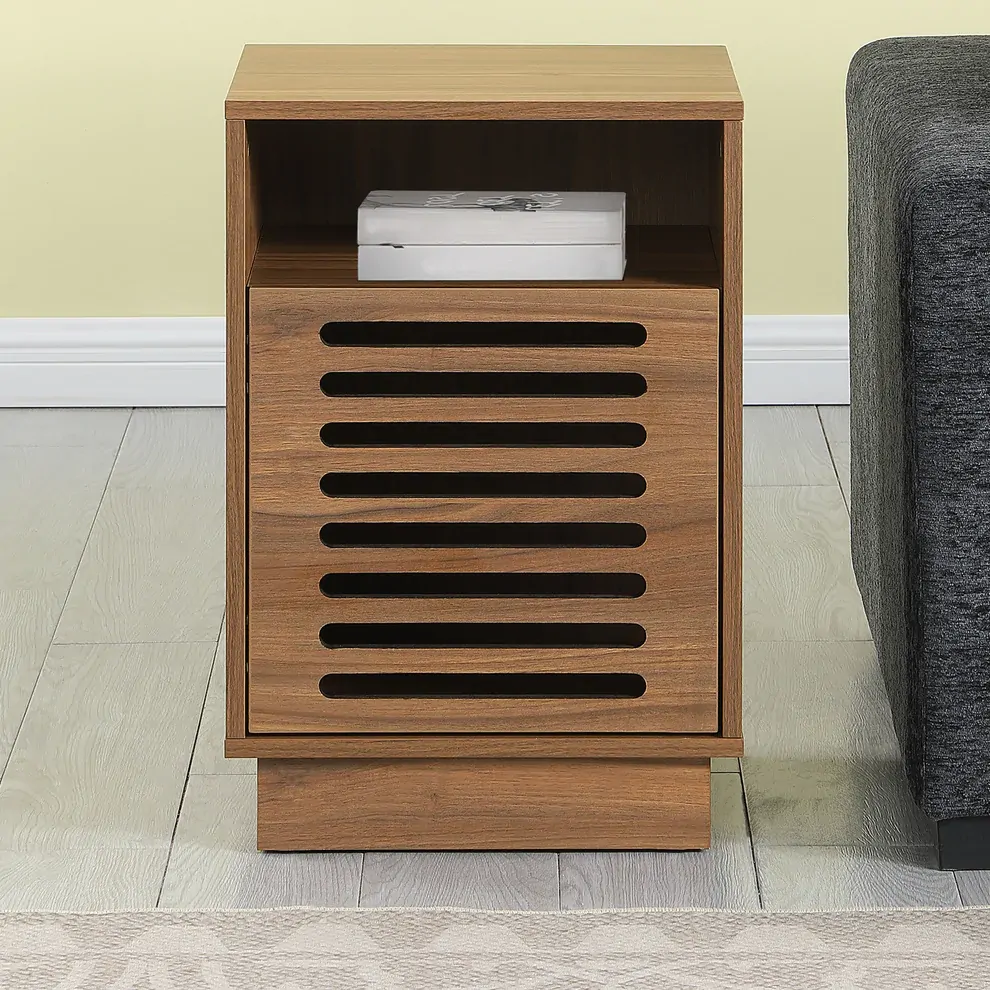 Behind the uniquely styled slotted door is an internal shelf, ideal for keeping personal items, chargers, or accessories out of sight. Above, an open shelf space allows you to style your favourite books, décor, or remotes for easy access.