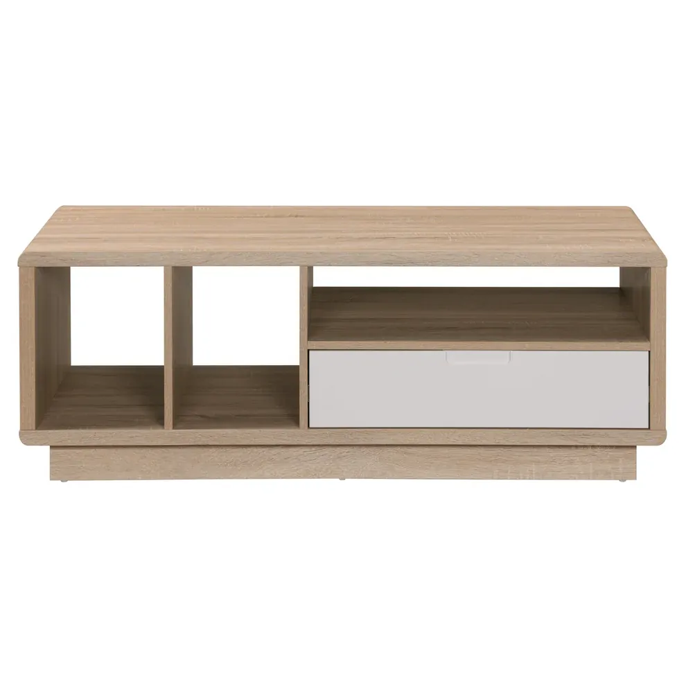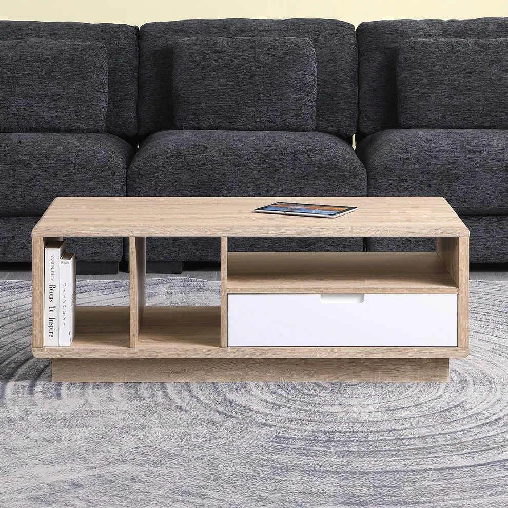 The Tauris HOVERCTLO Coffee Table is a bold expression of modern form and functional design. Finished in a fresh and grained light oak melamine veneer, this centerpiece effortlessly balances storage versatility with elegant simplicity. Its commanding silhouette is anchored by a contrasting white-painted drawer front, designed with a discreet cut-out handle for a clean, streamlined look.