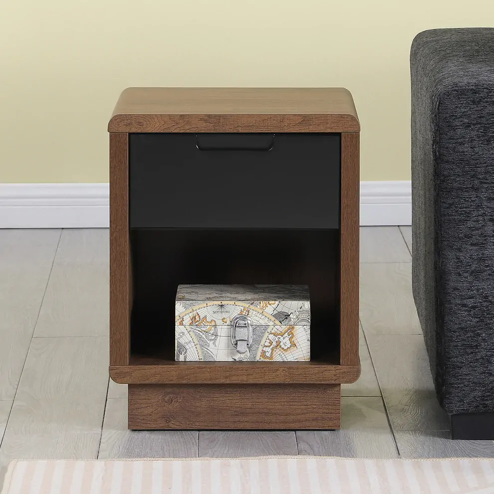 Stylish dark oak finish with contrast black drawer