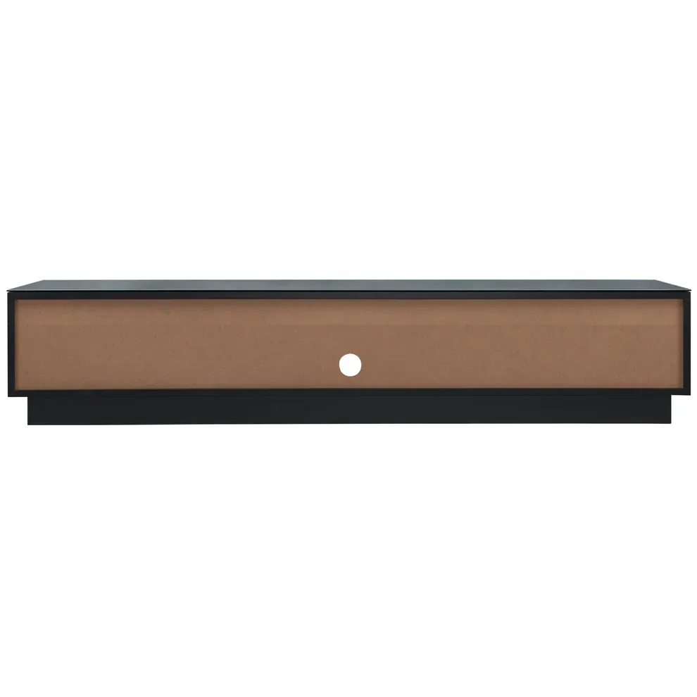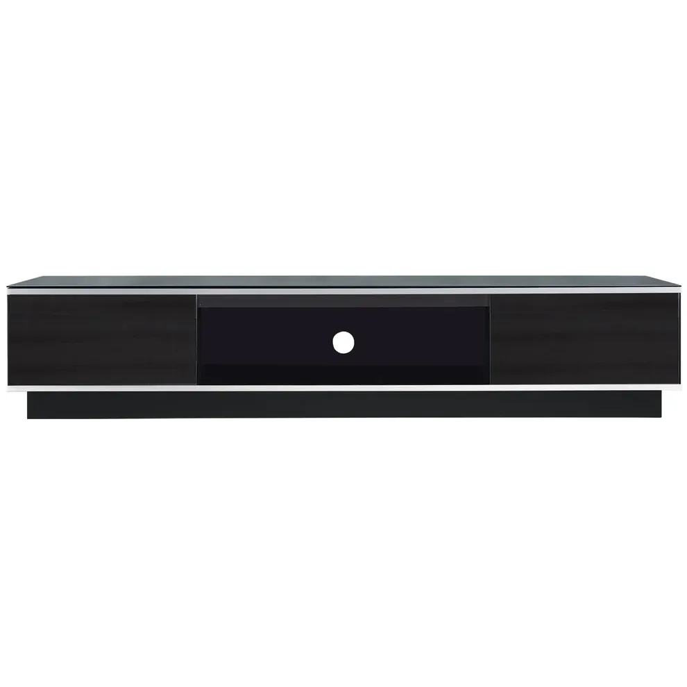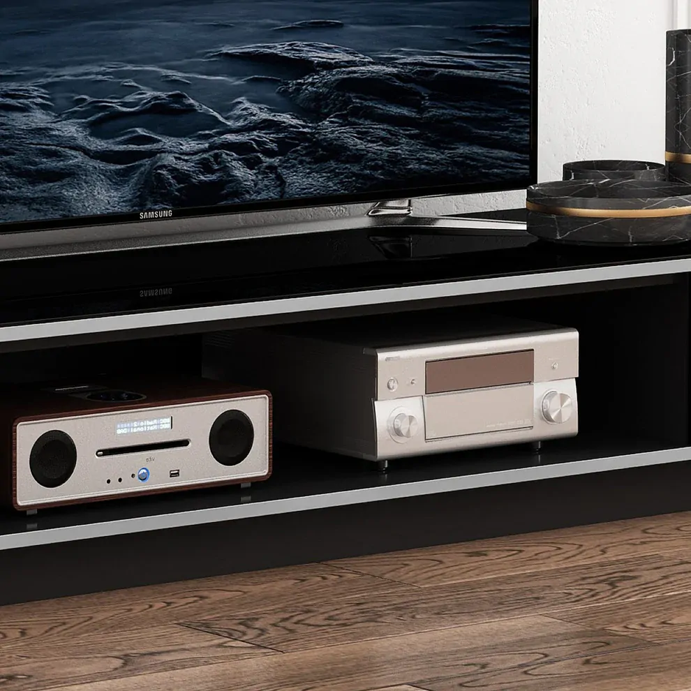 The Tauris Rio Entertainment Center is the perfect choice for both style and function. Constructed with a black cabinet and re-enforced to accommodate heavier TVs, its 550mm deep design allows for larger TV stands or legs. The two drawers have glass fronts - and the added benefit of cable management make this entertainment unit an ideal choice. Plus, with the large center speaker/sound bar shelf, the Tauris Rio Entertainment Center is perfect for all your large screen TV needs. The Top is stylishly finished with a sheet of tempered black glass. Item comes with a 12 month warranty.