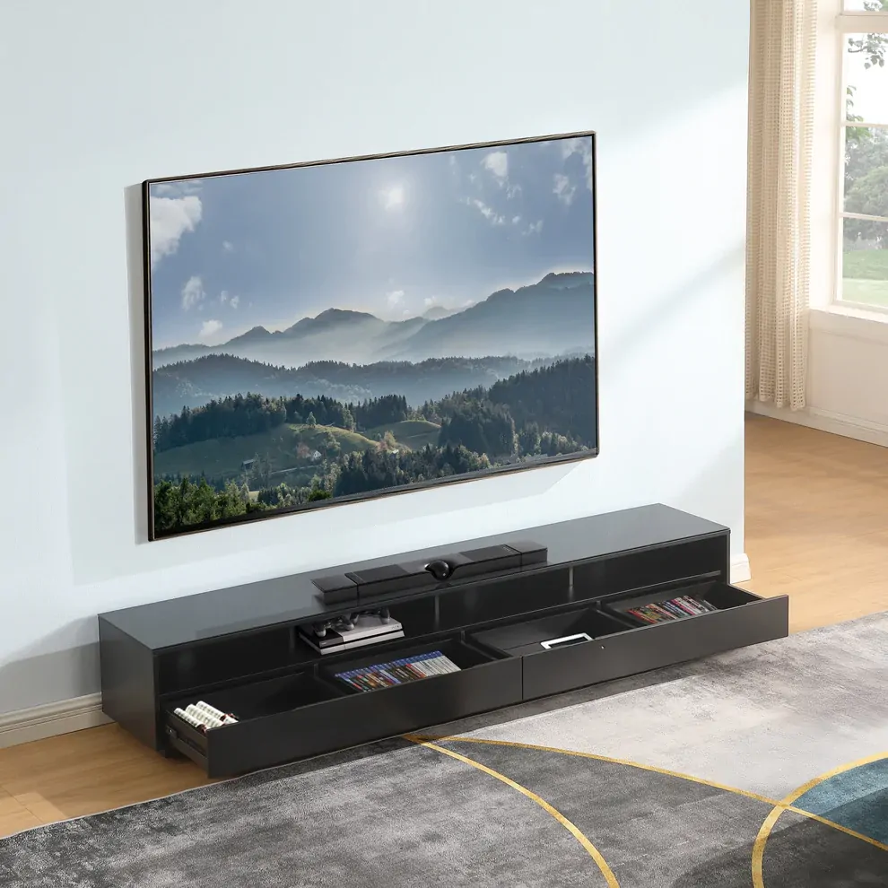Designed with versatility in mind, it features four spacious component shelves or an extended sound bar shelf option, two large drawers with four internal compartments, and built-in cable management to keep your setup neat and organized. The solid timber plinth enhances stability and style, while ball-bearing runners ensure smooth drawer operation.