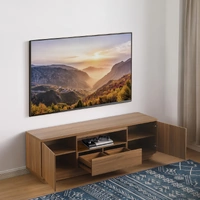 With a generously deep 450mm profile, it’s engineered to support today’s larger-format TVs and wider stands. The single drawer front opens to reveal two internal compartments on smooth telescopic runners, while the open component shelve with half-depth support is perfect for media players, receivers, or an extended sound bar system.