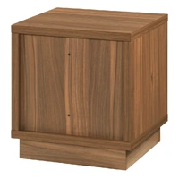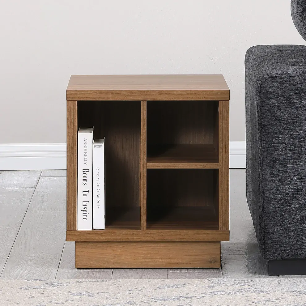 Crafted from durable MDF and finished in a rich walnut veneer, this trendy side table includes open shelving ideal for storing books, remotes, or decorative items. The wooden plinth base adds subtle height while keeping the overall profile grounded and minimal.