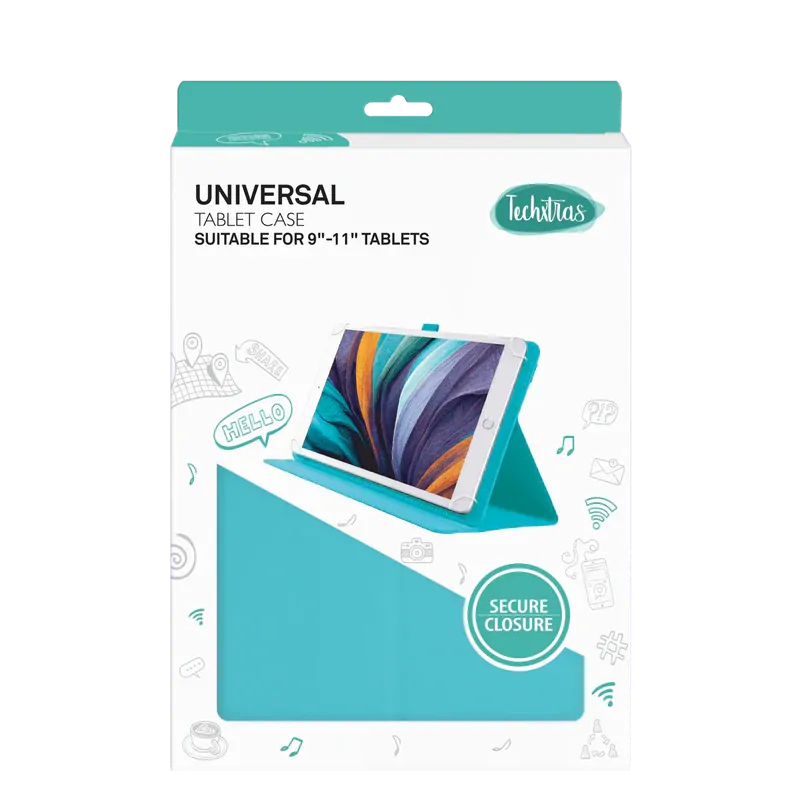 This Turquoise TechXtras Universal Tablet Case is suitable for 9" to 11" iPads with its adjustable elastic straps, offering a perfect fit every time. Featuring a built-in tri-fold stand, it lets you easily adjust your tablet to multiple angles, ensuring the best hands-free experience whether you're watching, typing, or drawing.