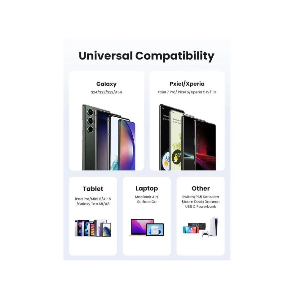 • Broad Compatibility: UGREEN USB C Cable compatible with iPhone 16 Pro Max/16 Pro/16 Plus/16, iPhone 15 Pro Max/15 Pro/15 Plus/15, Google Pixel 9/8/7/6/5/4, Galaxy Note 10/S24/S23/S22/S21/S20/S10/S9/S8, Nexus 6P 5X, Switch, LG G7 ThinQ V50, iPad Pro/Mini 5, MacBook, MacBook Pro, MacBook Air, Huawei Matebook X Pro, Mate 60 Pro, Chromebook, Dell XPS 13, Yoga 900 720, Razer Blade Stealth, ASUS ZenBook 3, HP Spectre notebook, Envy 13t.