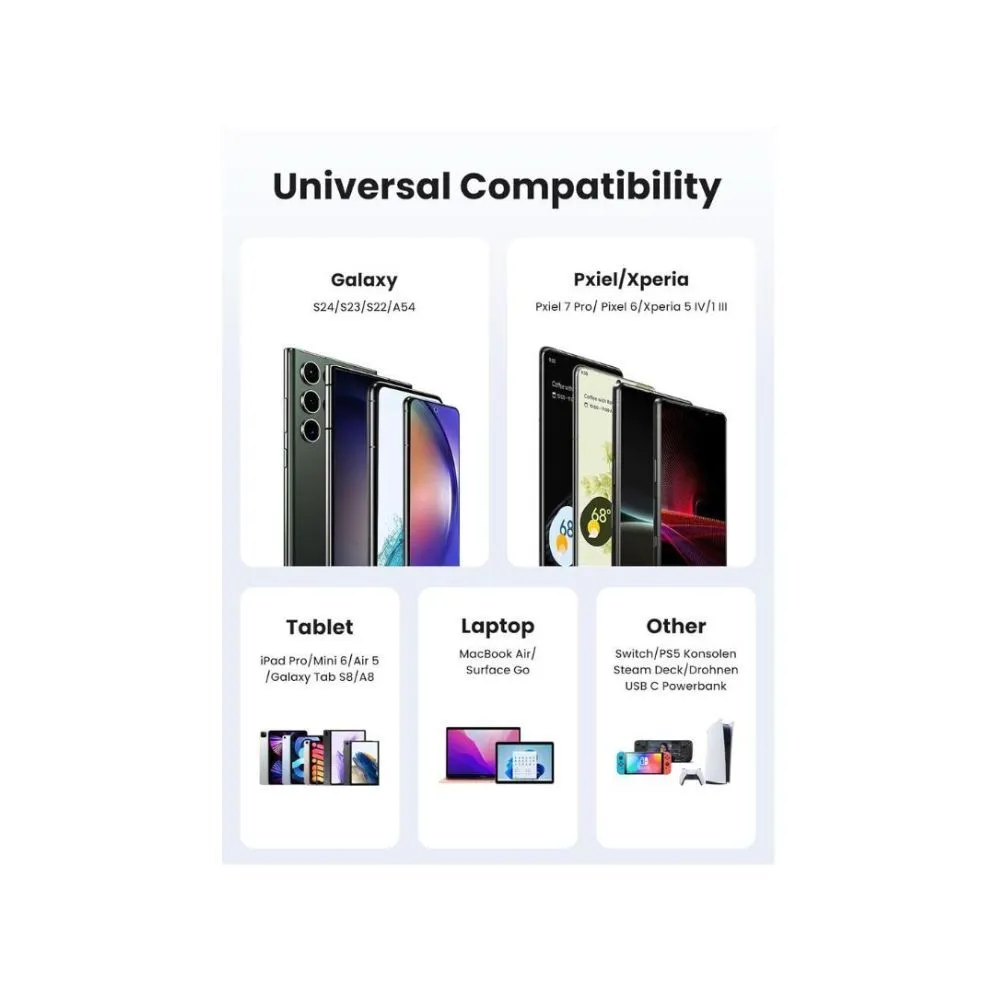 • Broad Compatibility: UGREEN USB C Cable compatible with iPhone 16 Pro Max/16 Pro/16 Plus/16, iPhone 15 Pro Max/15 Pro/15 Plus/15, Google Pixel 9/8/7/6/5/4, Galaxy Note 10/S24/S23/S22/S21/S20/S10/S9/S8, Nexus 6P 5X, Switch, LG G7 ThinQ V50, iPad Pro/Mini 5, MacBook, MacBook Pro, MacBook Air, Huawei Matebook X Pro, Mate 60 Pro, Chromebook, Dell XPS 13, Yoga 900 720, Razer Blade Stealth, ASUS ZenBook 3, HP Spectre notebook, Envy 13t.