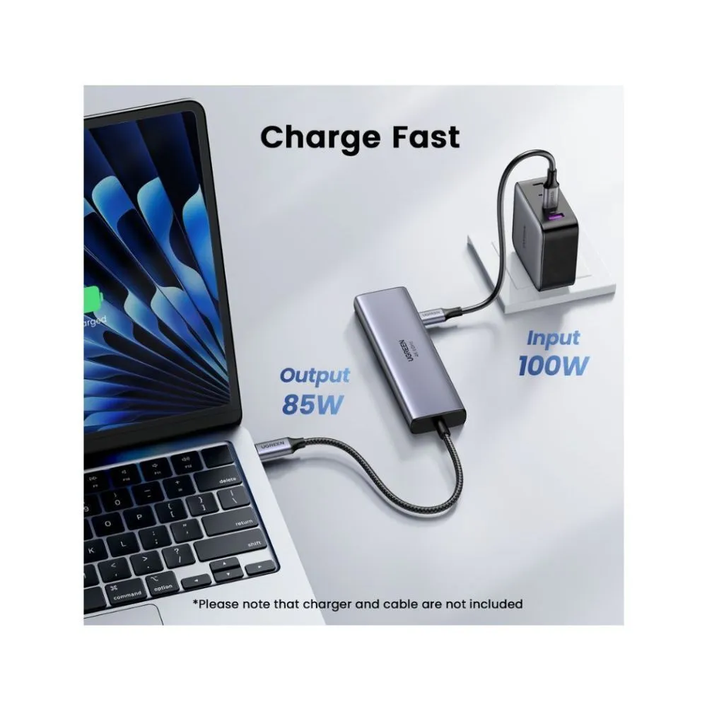 - Rapid Charging Capabilities: The hub supports input of 100W and output of 85W, allowing you to charge your devices quickly while in use. Please note that charger and cable are not included.