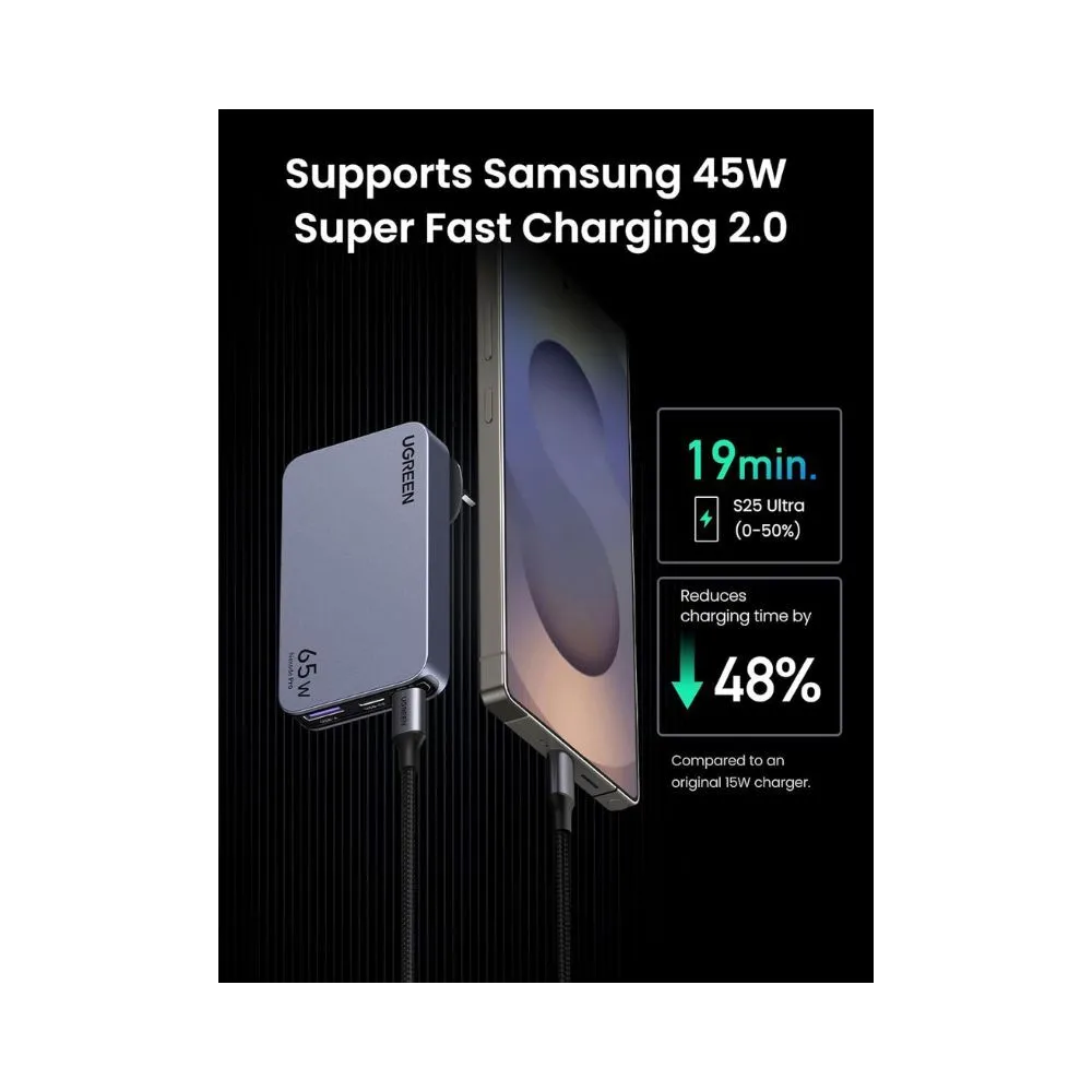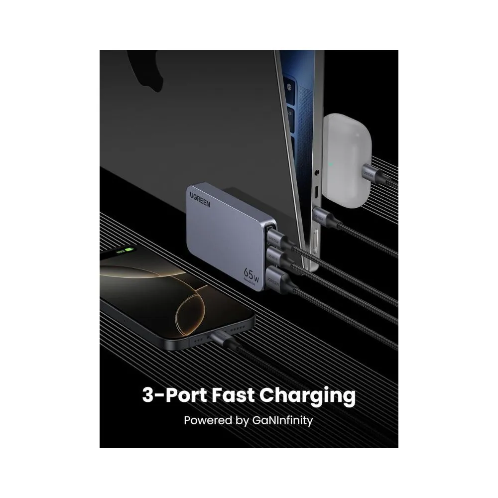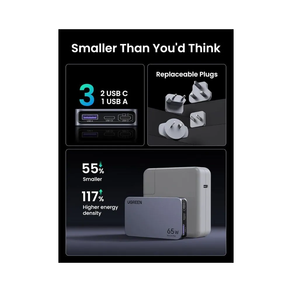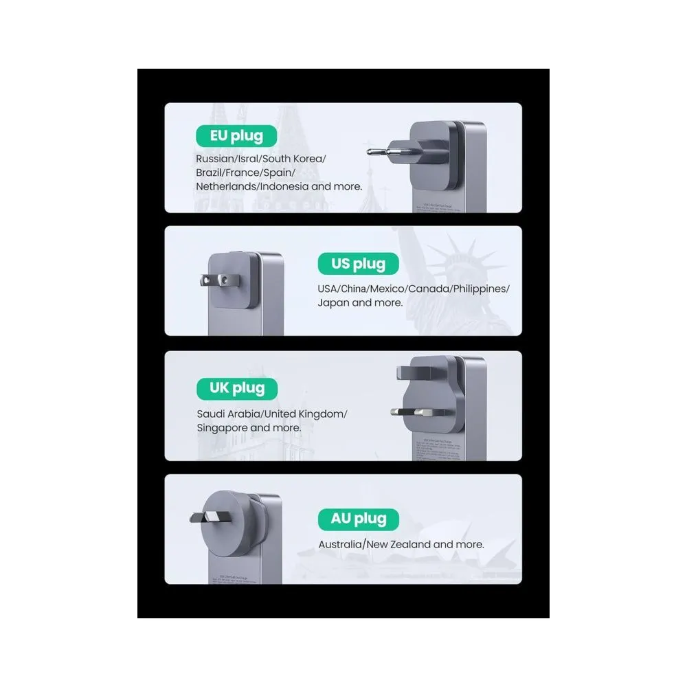 UGREEN Nexode Pro 65W Ultra-Slim Travel Charger delivers fast, reliable charging in a compact flat design that fits easily into tight spaces. With interchangeable US, UK, EU and AU plugs, it is built for convenient worldwide use while powering laptops, tablets and smartphones efficiently.