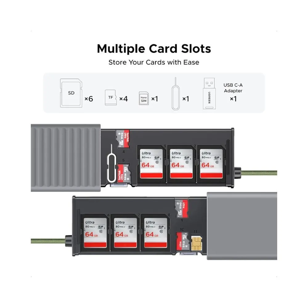 UGREEN Multi-Function Card Reader Case (55899) is the all-in-one solution for photographers, creators and travellers who need fast data transfer and secure card storage in one compact device. Combining a high-speed USB-C card reader with a protective storage case, it keeps your memory cards organised, protected and ready for use anywhere.
