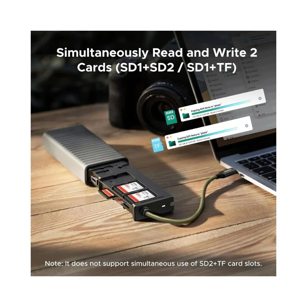 Supporting USB-C and USB-A connections with up to 5Gbps transmission speed, you can quickly back up photos and videos from SD and MicroSD cards to laptops, tablets or desktops. The shock-resistant silicone case prevents card loss while the plug-and-play design makes it ideal for on-the-go editing, VLOG workflows and professional shoots.