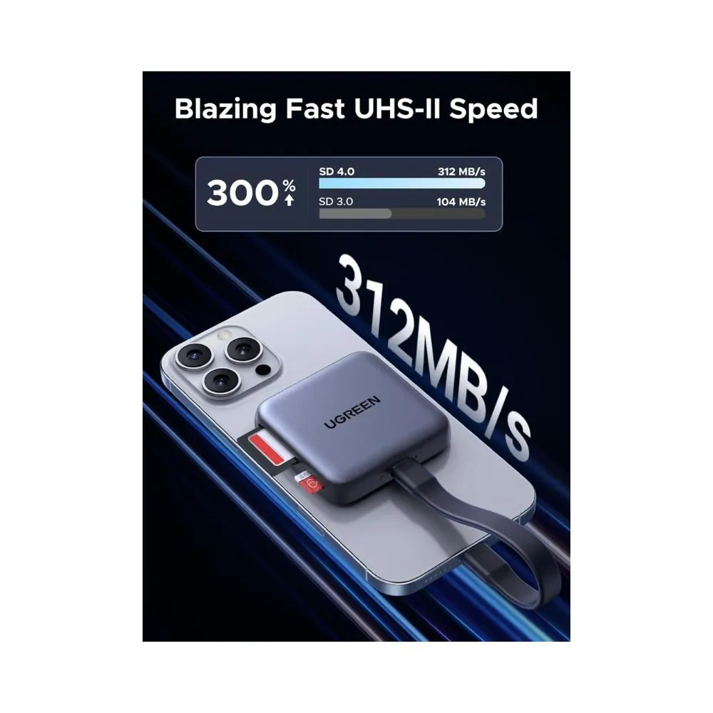 UGREEN Magnetic USB-C 3-in-1 Card Reader is designed for creators who need ultra-fast transfers and convenient charging on the go. Supporting SD 4.0 speeds up to 312MB/s, it lets you move large photo and video files in seconds from SD and MicroSD cards to your phone, tablet or laptop.