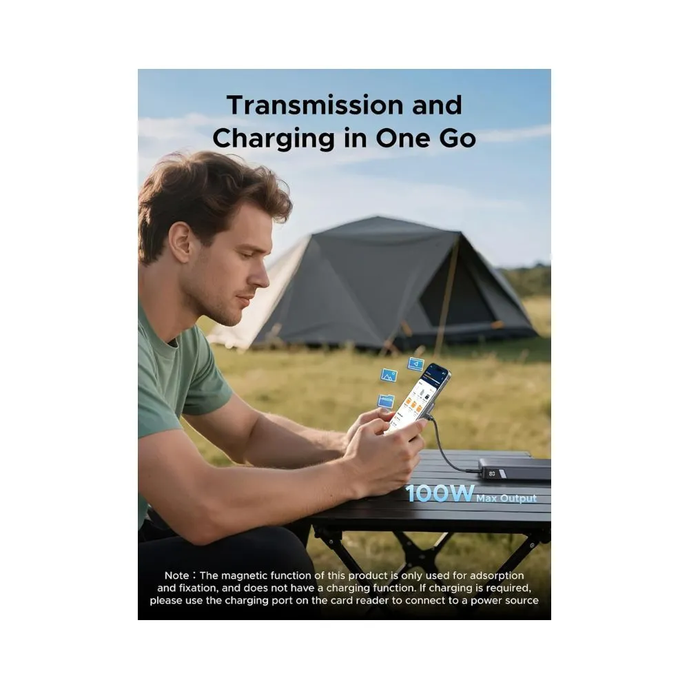 The magnetic fixation design keeps the reader securely attached during use, making it ideal for outdoor shooting and mobile editing. With USB-C Power Delivery up to 100W, you can charge your device while transferring data, keeping your workflow fast and uninterrupted.