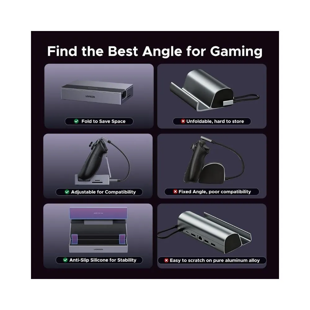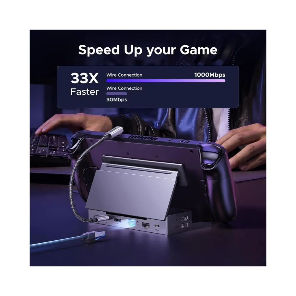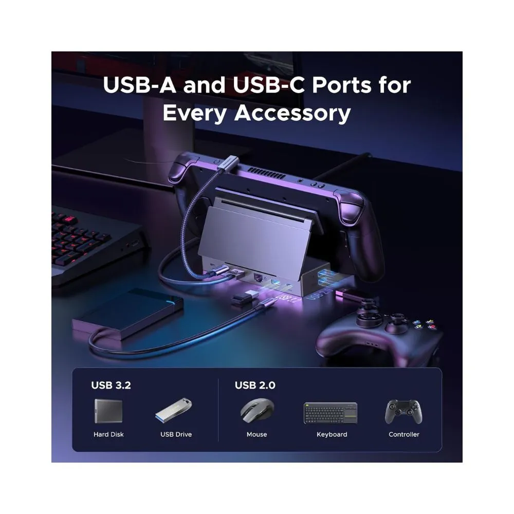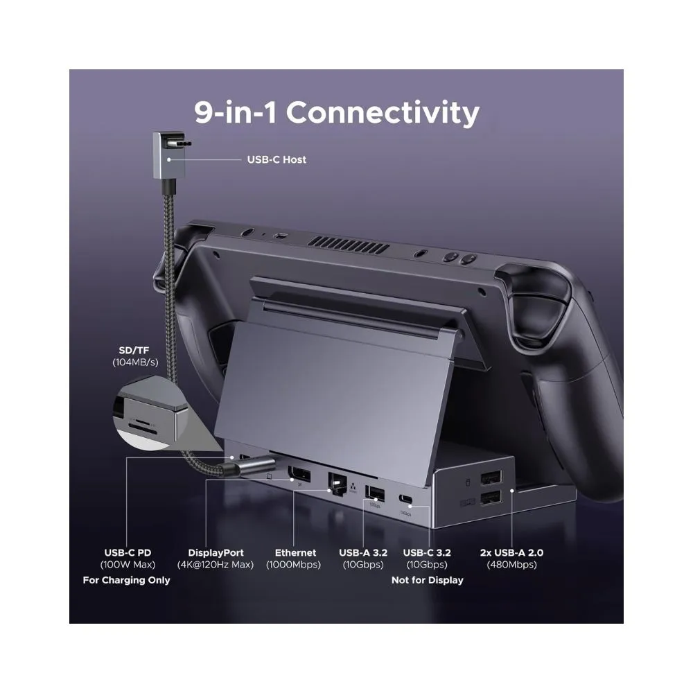 UGREEN 9-in-1 USB-C Steam Deck Dock transforms your handheld console into a full desktop gaming and productivity setup. Designed with a foldable, heat-friendly stand and DisplayPort 1.4 output, it delivers ultra-smooth visuals up to 4K@120Hz while expanding connectivity for storage, peripherals and fast charging.