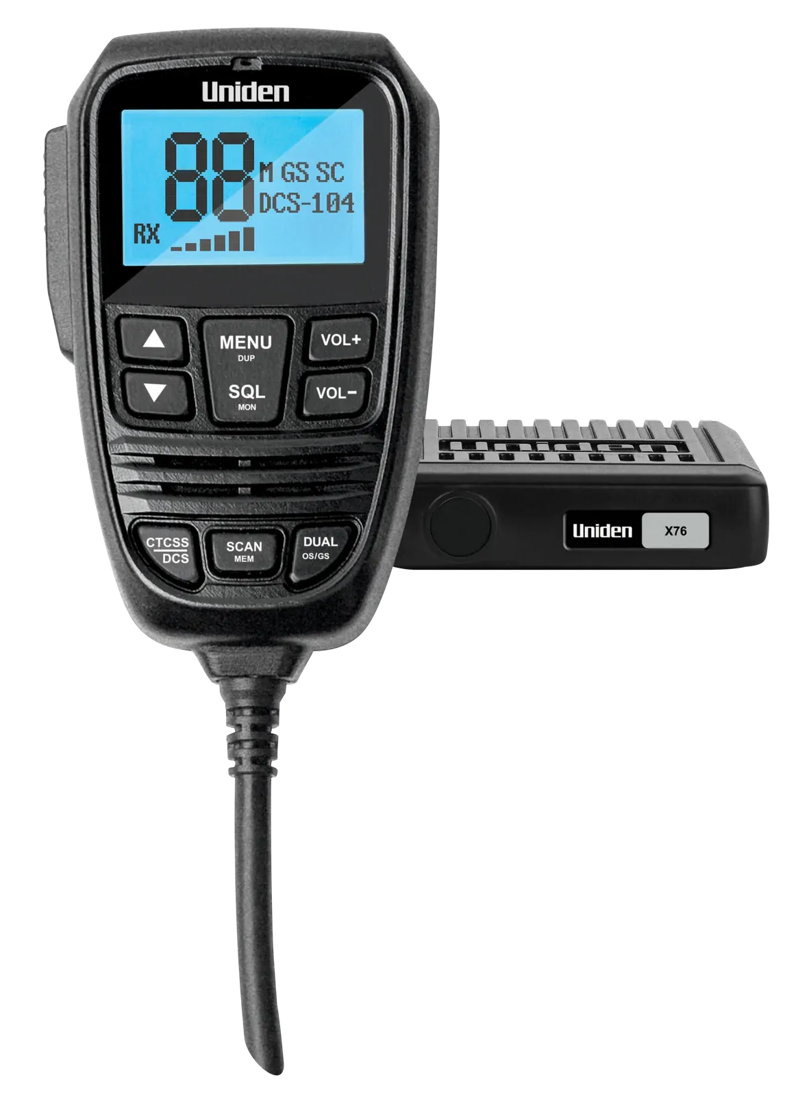 Uniden’s reliability and experience in UHF makes this unit ideal for the professional who needs to keep in touch with the outside world. The X76 offers the finest components, engineering and styling, just what you would expect from Uniden. The X76 has dual speakers in both the speaker microphone and base unit allowing for clear and loud volume ideal in a noisy vehicle.