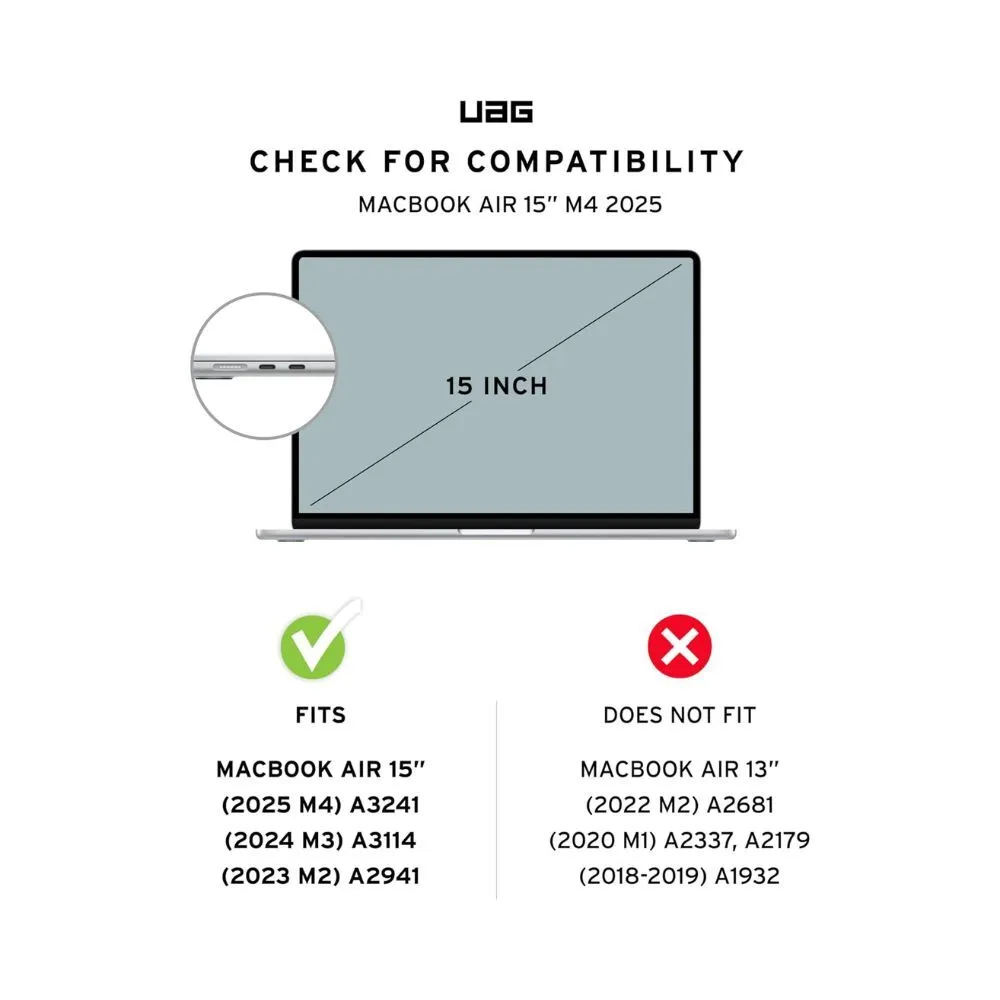 Protect your MacBook Air 15″ (2023–2025 models M2/M3/M4) with the UAG Plyo Case, featuring a rugged, one-piece hinge design that combines a stiff armour shell with a soft impact-resistant core. This case is Mil‑Spec drop tested (MIL‑STD‑810G 516.6) to cushion your device from bumps and knocks