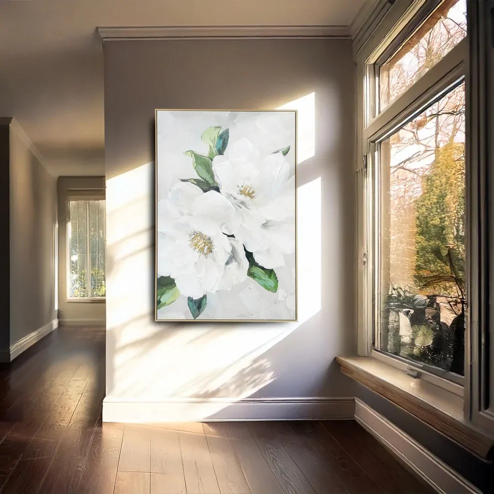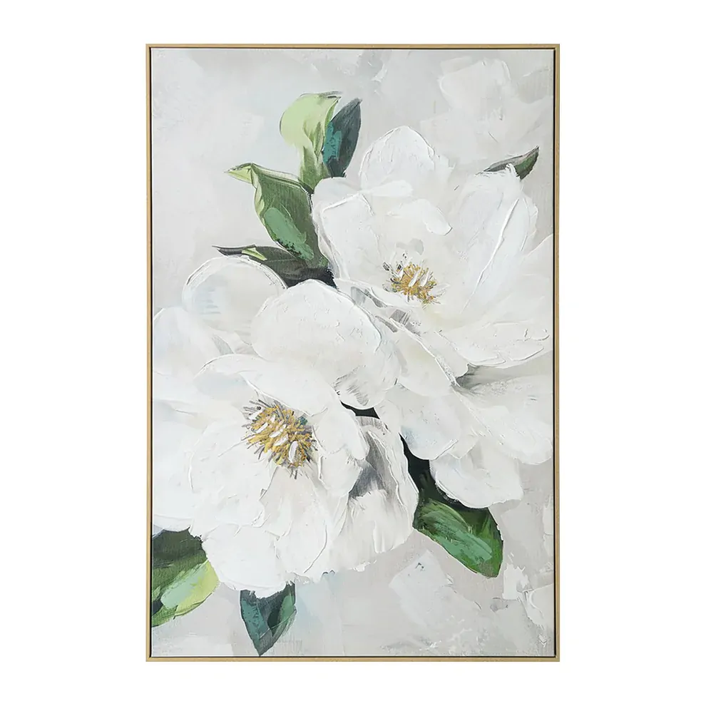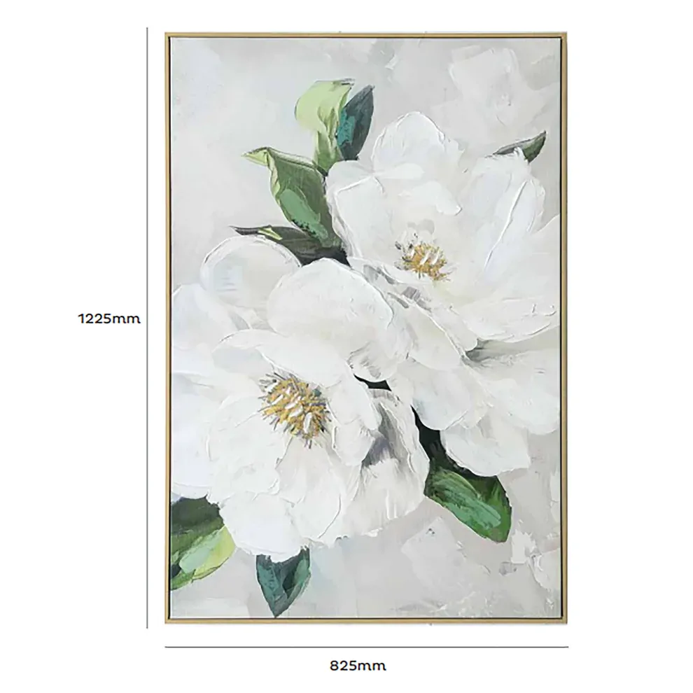 The White Magnolia are a beautiful, fragrant evergreen shrub or small trees known for their profuse, fragrant white flowers and glossy green foliage. This Brushmarks Hand Embellished Canvas print of White Magonolia's pays homage to this beauty.