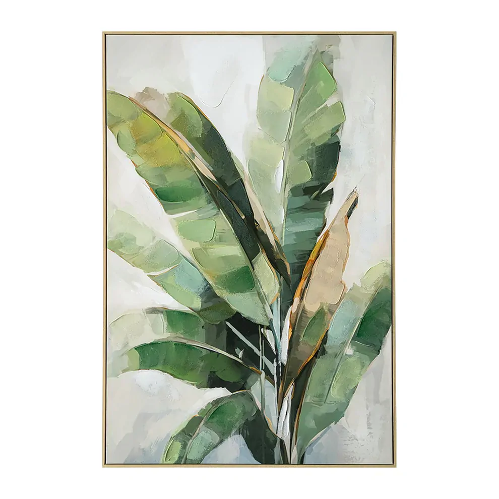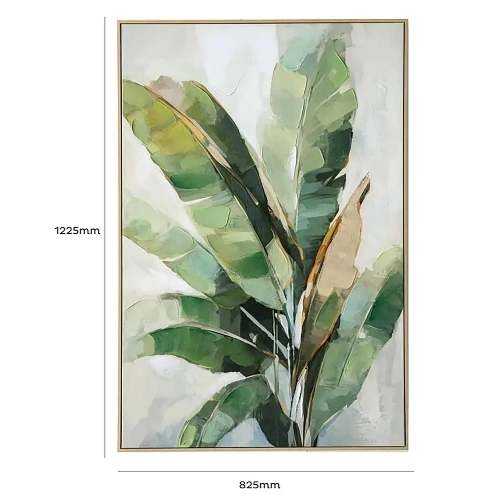 Introducing the Urban Style Brushmarks Embellished Print, featuring a printed canvas on a sturdy timber support frame. The 3D hand painted embellishments add depth and dimension to the banana palm print perfectly. The wood look plastic décor box frame is expertly fitted around the stretch canvas painting to further add a level of depth and complexity to your art piece. Elevate your space with this unique and expertly crafted piece.