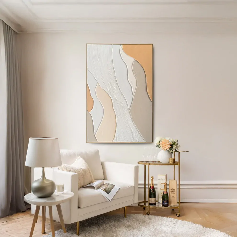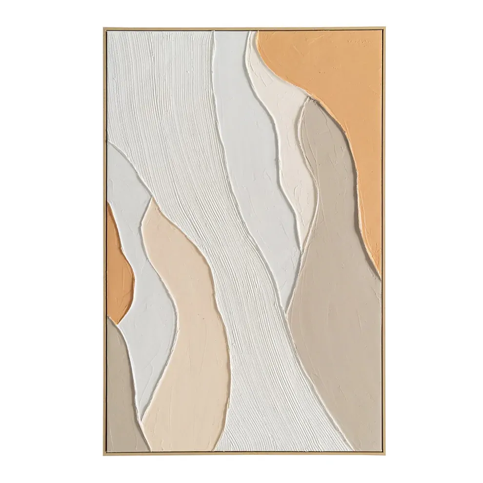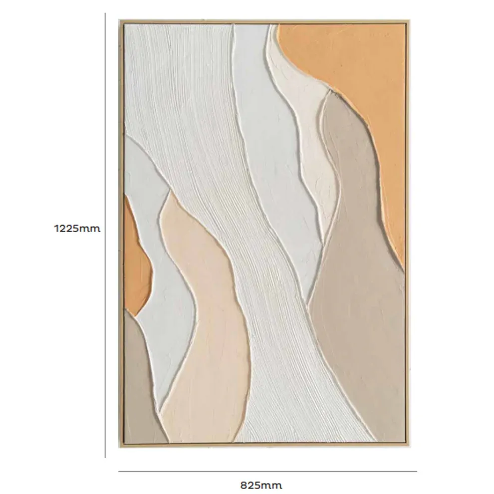Introducing the Urban Style Brushmarks Oil Painting, featuring a hand painted canvas on a sturdy timber support frame. The 3D textured oil painting adds depth and dimension to the apricot waves perfectly. The wood look plastic décor box frame is expertly fitted around the stretch canvas painting to further add a level of depth and complexity to your art piece. Elevate your space with this unique and expertly crafted piece.