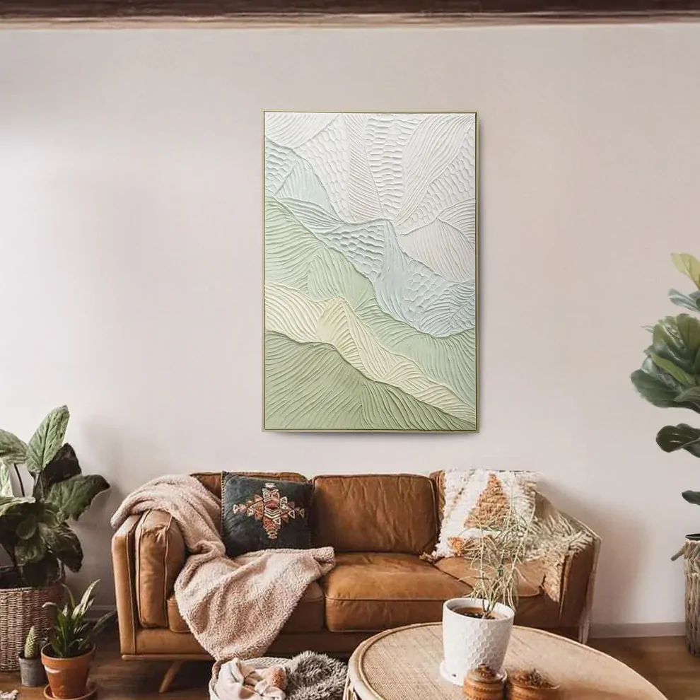The layered strokes, rich with tactile detail, evoke a soothing sense of natural beauty—each curve and contour resembling the gentle rise and fall of rolling hills. The harmonious blend of soft pastel hues, combined with intricate patterns, creates a piece that feels both calming and sophisticated. Perfect for those seeking art that brings a refreshing, peaceful ambience to their space.