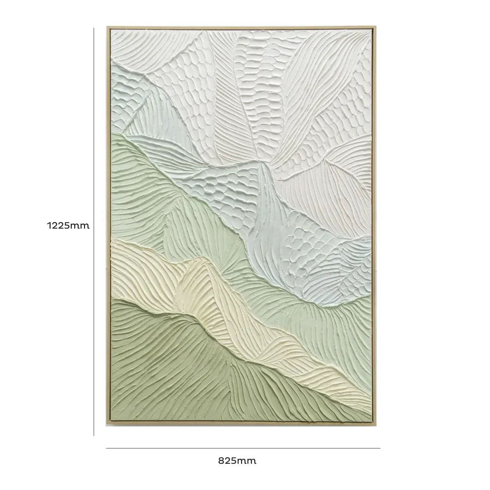 Introducing the Urban Style Brushmarks Oil Painting, featuring a hand painted canvas on a sturdy timber support frame. The 3D textured oil painting adds depth and dimension to the sage ripples perfectly. The wood look plastic décor box frame is expertly fitted around the stretch canvas painting to further add a level of depth and complexity to your art piece. Elevate your space with this unique and expertly crafted piece.