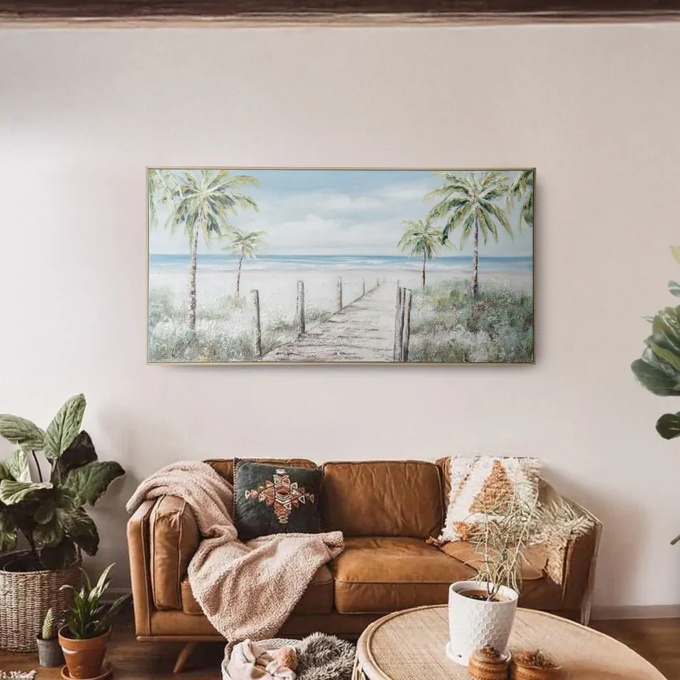 This breathtaking coastal painting captures the essence of serenity through its masterful brushwork. Textured, sweeping strokes create the illusion of soft sand beneath your feet, while delicate yet expressive brush marks form the lush palm fronds swaying gently in the breeze. The artist’s use of impasto techniques adds depth and dimension, making the ocean’s waves shimmer with light. This painting’s tactile quality invites you to reach out and feel the tranquility of the scene, bringing a sense of relaxation and tropical escape into your home. Perfect for brightening any space, it’s a piece that promises to transform your interior with its calming, coastal charm.