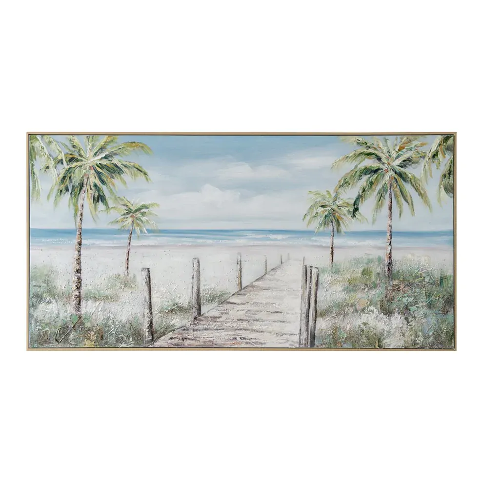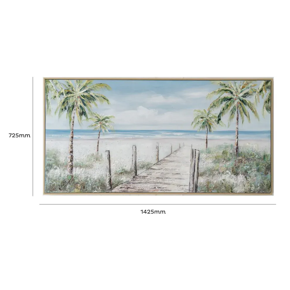 Introducing the Urban Style Brushmarks Oil Painting, featuring a hand painted canvas on a sturdy timber support frame. The 3D textured oil painting adds depth and dimension to the palm tree boardwalk perfectly. The wood look plastic décor box frame is expertly fitted around the stretch canvas painting to further add a level of depth and complexity to your art piece. Elevate your space with this unique and expertly crafted piece.