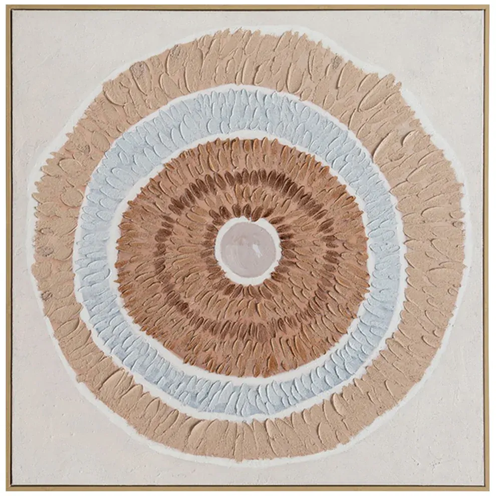 The intricate brush marks in this painting radiate with captivating texture and depth. Each stroke is meticulously layered, creating a mesmerizing circular pattern that draws the eye to its elegant centre. The use of raised, almost feather-like impressions adds a tactile quality that invites you to reach out and feel its artistry. Painted with rich earth tones and cool blues, the design evokes a sense of balance and serenity, perfect for complementing modern or rustic interiors alike. This piece will transform any space with its unique blend of texture and visual harmony, making it a must-have for art lovers seeking to enhance their home with a touch of sophistication.