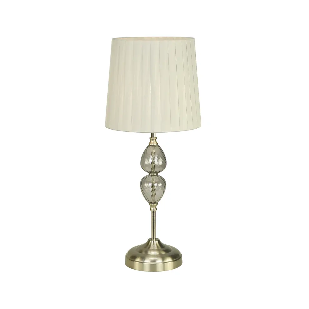 The Edith Bedside Lamp by Urban Style brings soft sophistication to your nightstand or reading corner. Crafted with a gleaming brushed metal base and detailed glass sphere accents, its timeless silhouette is beautifully complemented by a pleated fabric shade that diffuses a gentle, warm glow.
