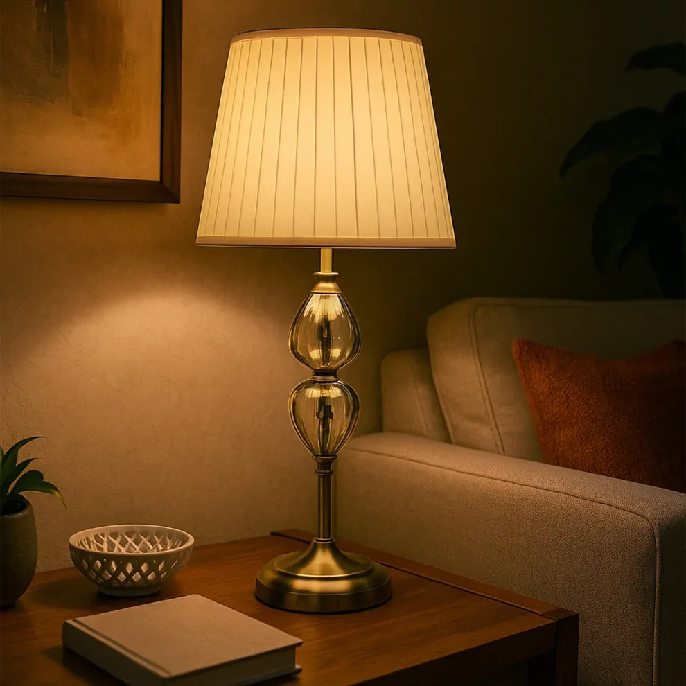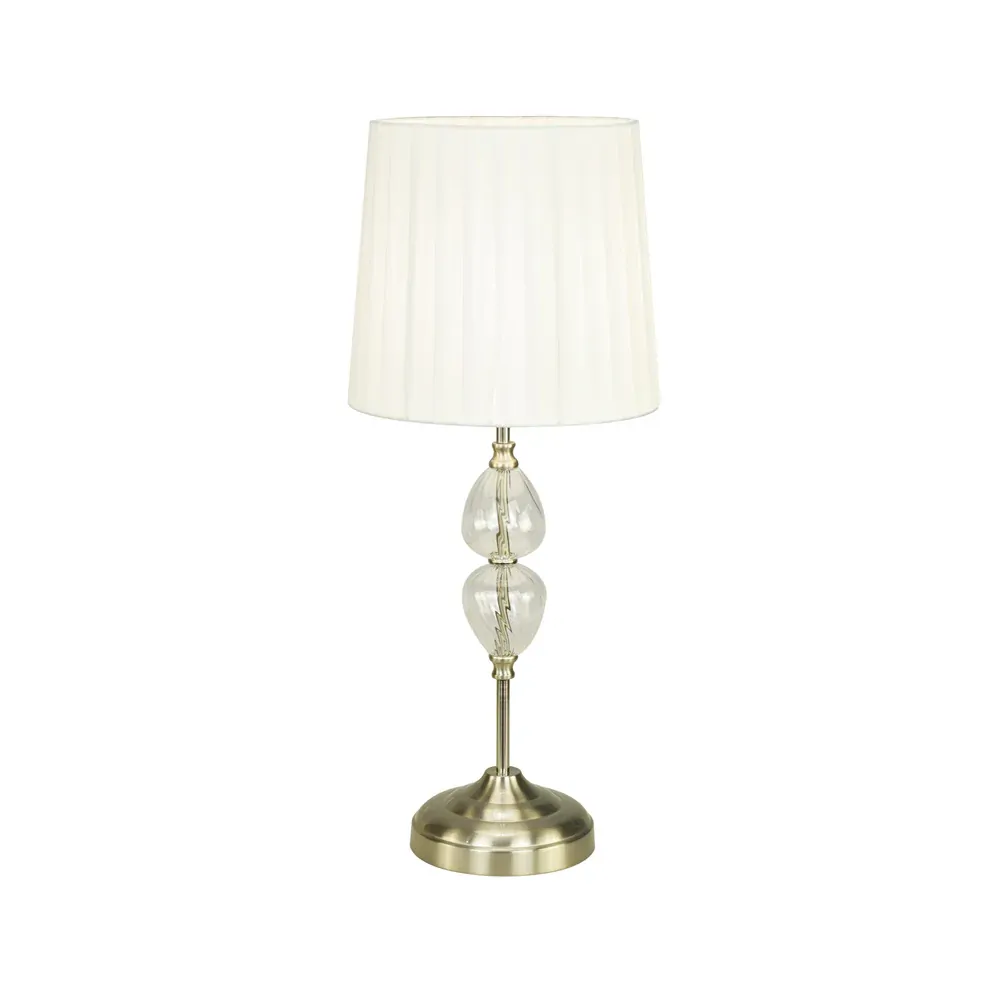 The Edith Bedside Lamp by Urban Style brings soft sophistication to your nightstand or reading corner. Crafted with a gleaming brushed metal base and detailed glass sphere accents, its timeless silhouette is beautifully complemented by a pleated fabric shade that diffuses a gentle, warm glow.
