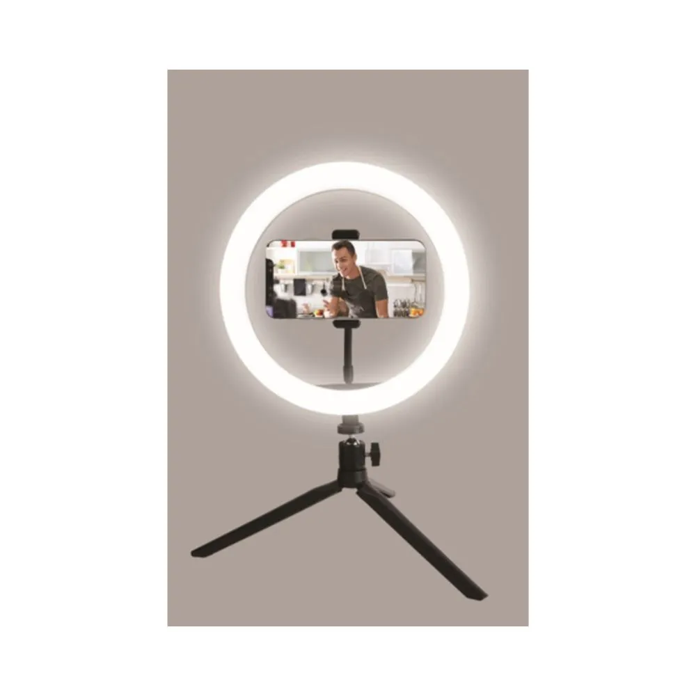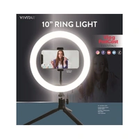 Vivitar Deluxe LED Ring Light has a phone cradle tripod for mounting your device while vlogging, with a rubber neck for finding the optimal angle. It has a 10-inch ring light to ensure that all the visuals that you capture have clarity. It has a wireless shutter release. This ring light ensures that your visuals have clarity. It comes in a black design.