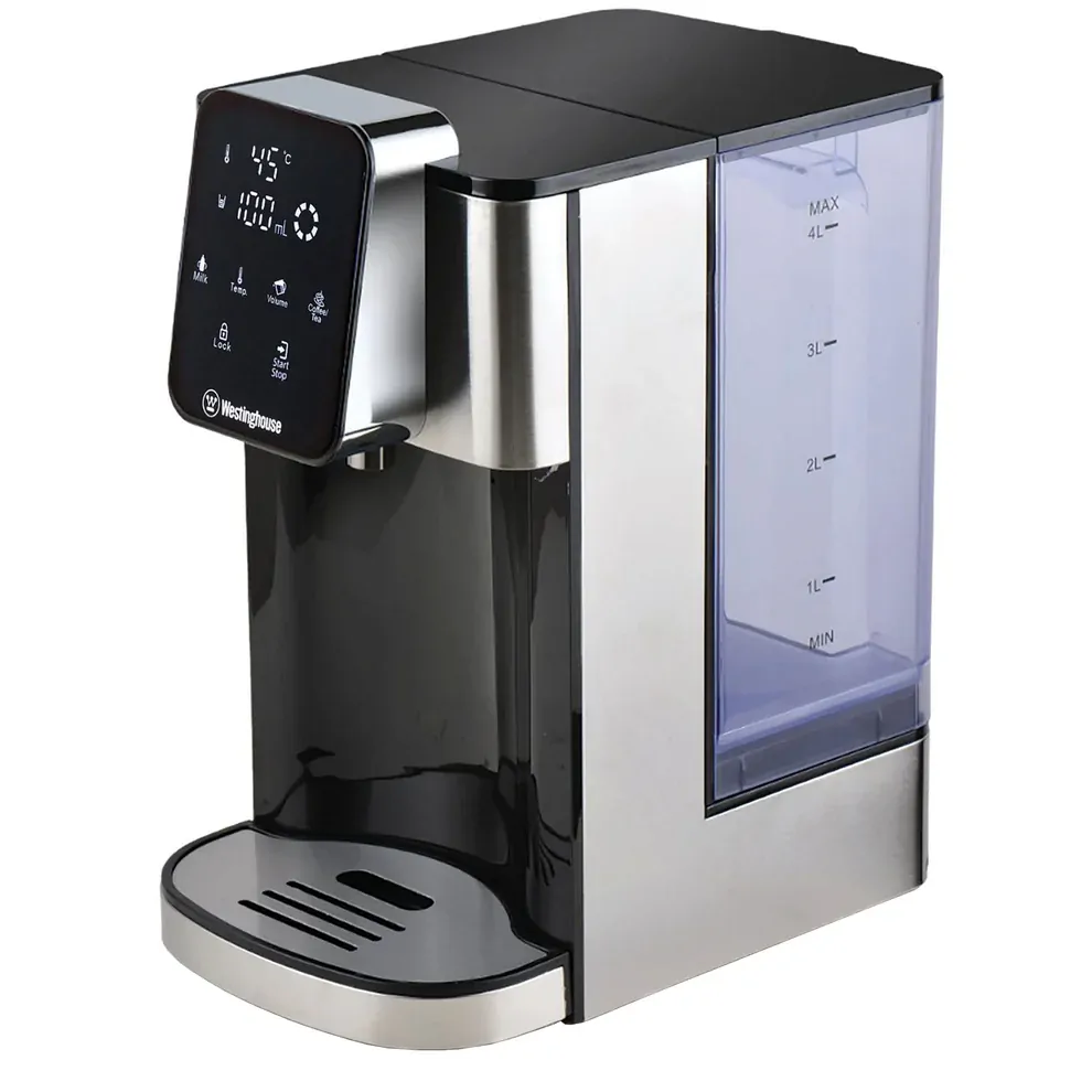 This Westinghouse hot water dispenser will provide hot water exactly when you need it. Its stainless steel finish is elegant and stylish, while its LCD display and adjustable temperature and volume controls let you customize hot water distribution. The dispenser can reach temperatures of up to 100 degrees in under 7 seconds, and features a removable water tank, with a 4L capacity and elevated drip tray for small cups and bowls. A child safety lock and baby bottle function add an extra level of safety.